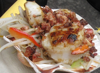 Capesante al Borough MarketNella pagina web del mercato (sì, persino il mercato ha un ricchissimo sito) c’è una bella mappa con tutte le bancarelle presenti nei diversi giorni e orari: non si trovano sempre tutte. Queste capesante, per esempio, sono in vendita solo il giovedì, il venerdì e il sabato (che sono i giorni di ostriche & co).