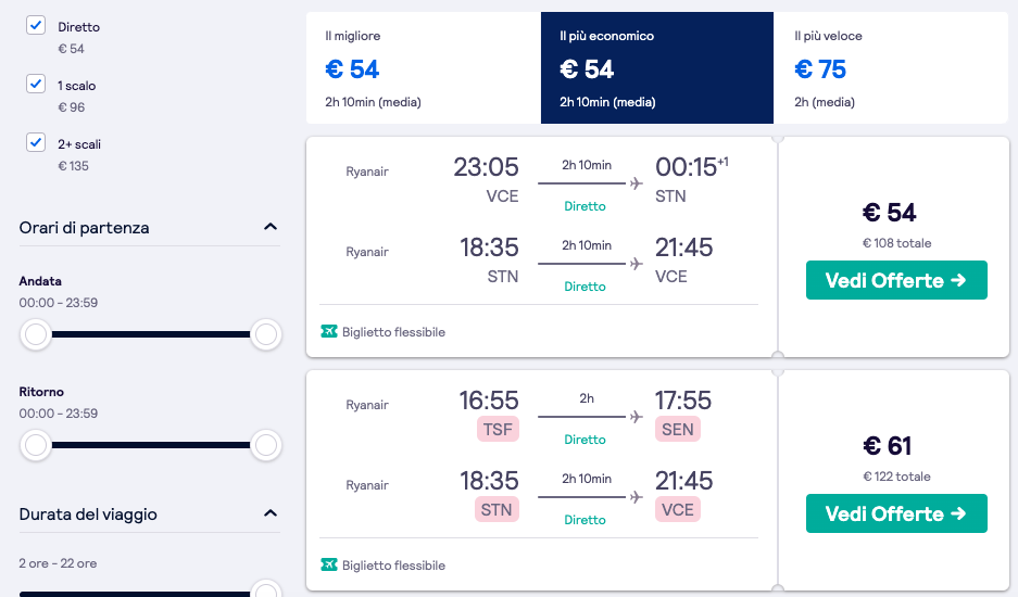 In questo caso la possibilità più economica è offerta da Ryanair, con un volo a 54 euro a persona (andata/ritorno). Una cosa di cui bisogna tenere conto, però, sono gli orari: nella nostra ricerca il volo più economico prevede la partenza da Venezia alle 23.05 di sera. Se per noi è un problema trovarci a Londra – magari per la prima volta – a notte fonda, conviene prendere in considerazione una delle combinazioni successive. La seconda sembrerebbe avere buoni orari a un prezzo basso, ma come vedete segnalato in rosa, si parte e si arriva in aeroporti diversi (anche questo non è il massimo). Scorrendo, si vede che bisogna spendere 75 euro a persona per avere aeroporti e orari ottimali.