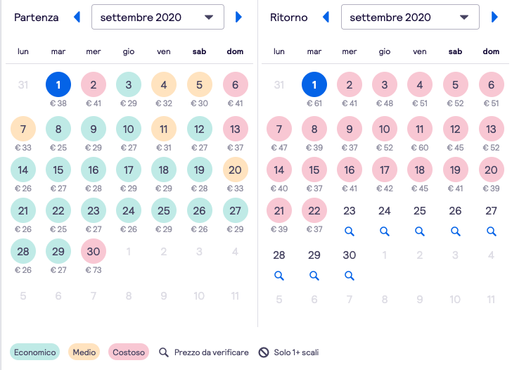 Nel riquadro di ricerca di Skyscanner inserite la città di partenza (anche in questo caso selezionate “qualsiasi” se la vostra città ha più di un aeroporto), “Londra qualsiasi” come destinazione, il numero di persone e di eventuali bimbi o ragazzi. A questo punto, aprite il calendario della data di partenza, scegliete il mese in cui volete partire dal menu a tendina e quello in cui volete tornare, selezionando poi “tutto il mese”. Ipotizzando una ricerca con “settembre 2020” come mese di partenza e arrivo, questo è il risultato: